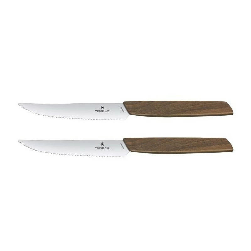 Cette boîte cadeau contient 2 couteaux à steak issus de la prestigieuse série Swiss Modern de la marque Suisse Victorinox. Ils sont aisément identifiables pour leur manche en bois noyer de haute qualité, apportant style et élégance à la table, ainsi qu’une ergonomie aux petits oignons ! Il est vrai que les manches confèrent énormément de confort quand à la prise en main : des manipulations toujours très agréables.