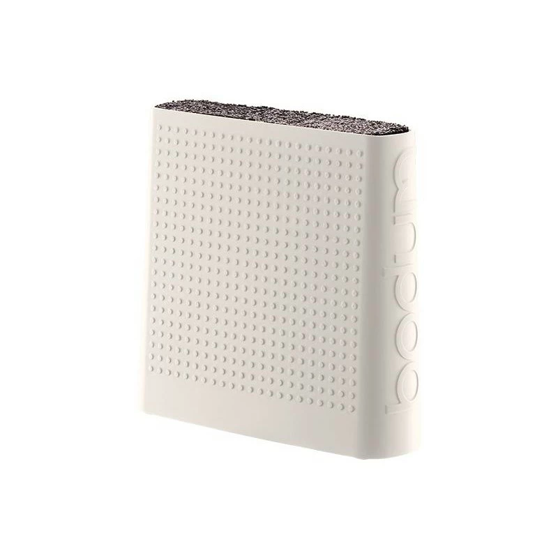 Conçu en silicone et plastique blanc, ce bloc pour couteaux Bodum référence 11089.913 ne prend que très peu de place dans la cuisine et dispose d’une allure très élégante. À l’intérieur du bloc se trouve un ensemble amovible de lanières en nylon compatible avec le lave-vaisselle. Qui plus est, le bloc universel Bodum blanc permet de recevoir tous les types de couteaux et accessoires. La base est antidérapante ce qui permet au bloc de ne jamais glisser, très pratique lors des utilisations quotidiennes. On notera également la présence du texte « Bodum » inscrit sur le côté en référence au fabricant. Un bloc pour couteaux de cuisine design, facile d’entretien et accessible financièrement !