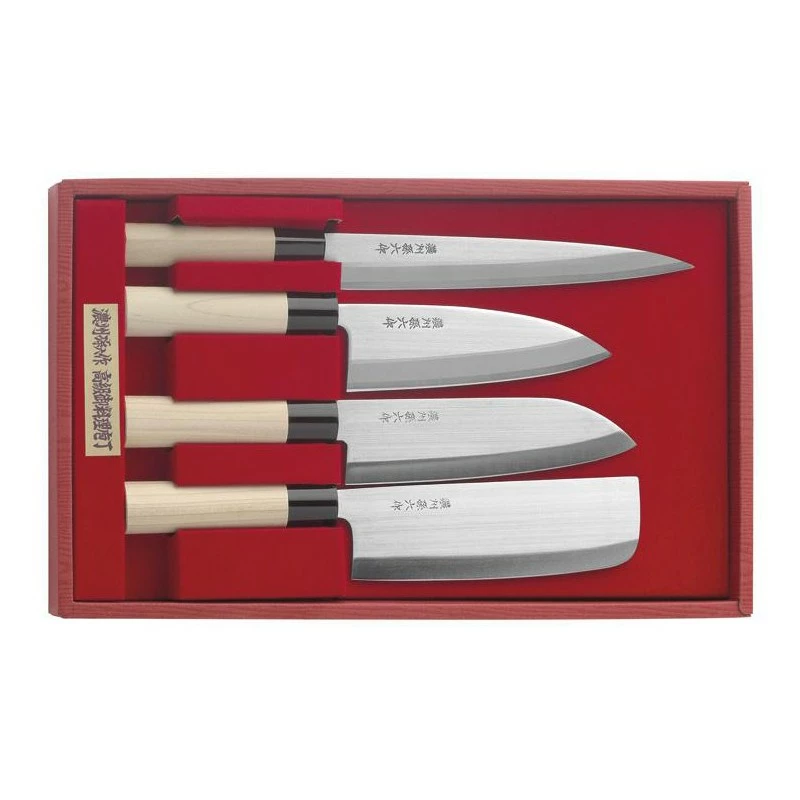 La cuisine Japonaise, c’est tout un art ! Pour rĂ©aliser de bons petits plats, dans les règles de l’art, rien de mieux que d’utiliser des couteaux de cuisine Japonais. Ce coffret en contient justement 4, ils ont l’avantage de tous ĂŞtre harmonieux et d’ĂŞtre adaptĂ©s pour la dĂ©coupe de diffĂ©rents aliments. On retrouve par exemple un couteau idĂ©al pour la rĂ©alisation de sushis et sashimis, des mets typiquement Japonais. Ce modèle possède une lame de longueur 21cm, il y a aussi un couteau Kodeba de 16cm pour optimiser la dĂ©coupe du poisson. Enfin, on retrouve Ă©galement un couteau Santoku et Nakiri, tous deux dotĂ©s d’une lame de 17cm de long. Le premier est très polyvalent, ou encore multi-tâches, le second convient plus particulièrement pour les lĂ©gumes. Les 4 couteaux de cuisine Japonais sont dotĂ©s d’un manche en bois, avec une touche sombre entre la poignĂ©e et le manche pour la touche design. Ils sont bien mis en avant sur un tissu rouge confĂ©rant une allure classe et distinguĂ©e, pour ne pas dire luxueuse. Un coffret d’exception pour celles et ceux qui apprĂ©cient les couteaux Japonais, des modèles rĂ©putĂ©s dans le monde entier !