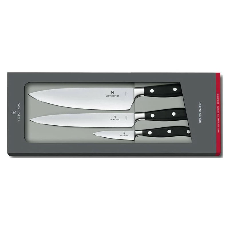 Ce coffret Victorinox 7.7243.3 contient 3 couteaux de cuisine, tous issus de la série Grand Maître avec ici un manche riveté en polyoxyméthylène plus connu sous le nom de POM. À noter qu’une mitre est présente pour éviter que la main ne vienne glisser durant les découpes (sécurité accrue). Le coffret Victorinox contient un couteau d’office pour couper les fruits et légumes, un couteau à découper/tranchelard pour le jambon, le rôti ainsi qu’un couteau de chef relativement polyvalent. La lame du modèle office mesure 8cm, contre 20 pour les deux autres couteaux, elles sont forgées à Solingen en Allemagne afin d’être très robustes et tranchantes. Pour information, elles sont aussi décorées par le logo Victorinox (motif croix Suisse). Grâce à ce coffret, vous aurez un vaste attirail à votre disposition vous permettant d’avoir le couteau de cuisine adapté à votre aliment. Parfait pour offrir, de plus, les 3 couteaux Victorinox Grand Maître sont compatibles avec le lave-vaisselle.