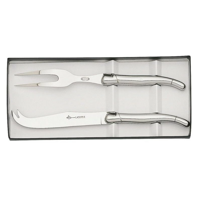 Ce coffret Laguiole G.David est parfait pour offrir à un amateur de fromages. En effet, il se compose de deux pièces conçues spécialement pour la découpe de fromages : un couteau ainsi qu’une fourchette. Les deux pièces sont toutes les deux fabriquées intégralement en acier inox brillant avec manches guillochés : en plus d’être magnifiques, elles sont idéales pour la découpe du fromage. Vos invités seront époustouflés lorsque vous servirez le fromage à table : en plus, vous avez la possibilité de personnaliser le verso de la lame du couteau à fromage Laguiole G.David.