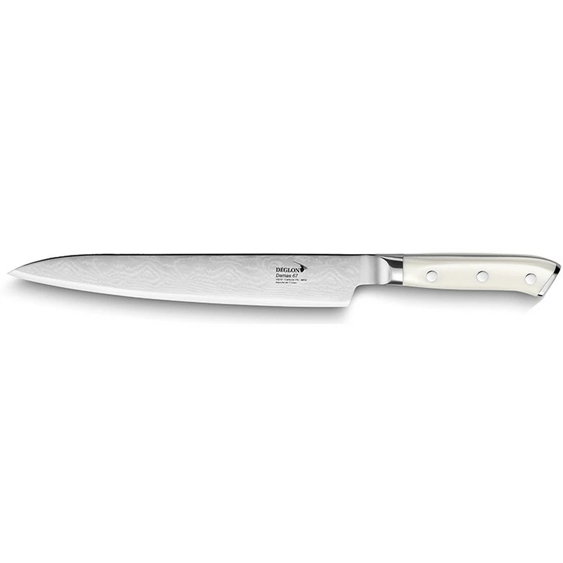 Ce couteau à découper Déglon est issu de la collection Damas 67 de la marque Française. S’il appartient à cette gamme prestigieuse, c’est parce que sa lame de 23cm de longueur est fabriquée en acier Damas VG-10 + 66 couches d’aciers 420 et 431. Un acier de grande qualité, qui permet à la fine lame de trancher soigneusement de nombreux aliments comme le jambon, le gigot, le rôti mais aussi le poisson … À noter que la lame damas est décorée par le logo Déglon, ce qui fera le bonheur des cuisiniers professionnels fans de la marque.