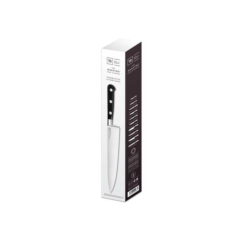 Conçu et fabriqué en France, ce couteau à steak TB Maestro Idéal dispose aussi d’un manche noir en POM très élégant, et surtout très ergonomique. Il tient très bien en main, ce qui permettra au chef de cuisine de couper/trancher les viandes avec précision et netteté. Design, la poignée noire est rivetée pour une petite touche de modernité supplémentaire. TB Maestro, la référence du couteau de cuisine professionnel ! Fabrication 100% Française.