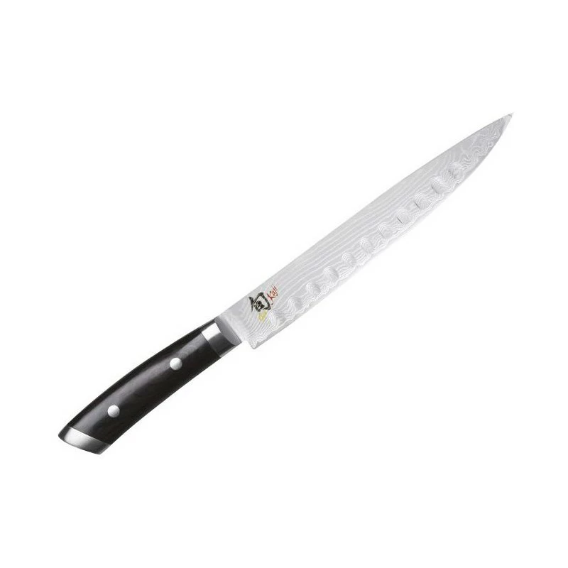 La série Shun Kaji signée Kai, marque Japonaise, regroupe des couteaux de cuisine de très haute qualité. Comme notamment ce couteau à trancher doté d’une lame de 225mm de longueur fabriquée en acier damas 32 couches avec noyau central en acier SG2. Un acier dont la dureté est très élevé selon l’échelle de Rockwell (environ 64). Décorée par le motif Shun Kaji, la lame damas est alvéolée ce qui s’avère très pratique lors des découpes du jambon par exemple. On peut également remarquer que la grande lame est décorée par de nombreux motifs vagues très caractéristiques de l’acier damas. En plus d’être un gage de qualité, cela procure également un certain charme au couteau de cuisine.