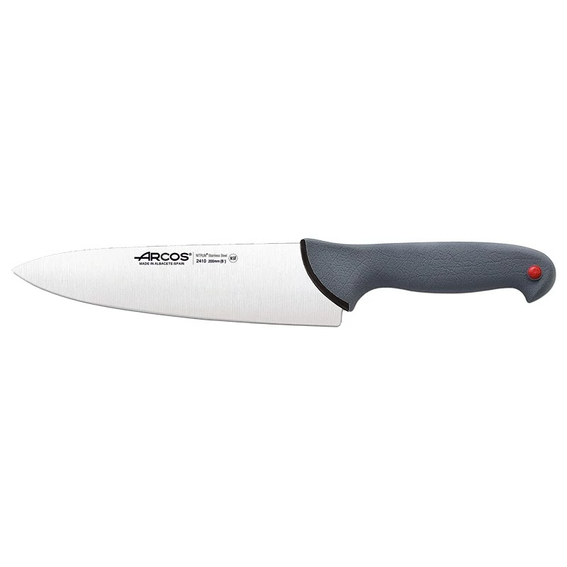 Après avoir parlé de la lame, parlons un peu du manche gris. Comme très souvent chez Arcos gamme Colour Prof, il est fabriqué en polypropylène (PP) et recouvert d’élastomère afin de le rendre antidérapant : un manche qui tient très bien en main : parfait pour les cuisiniers professionnels. De plus, des clips colorés en PP sont également fournis pour permettre d’identifier très facilement chaque couteau de chef. Grâce à ce système simple mais ingénieux, le cuisinier pourra associer un couteau en particulier à un aliment pour un travail exemplaire dans le respect total des règles d’hygiène en vigueur.