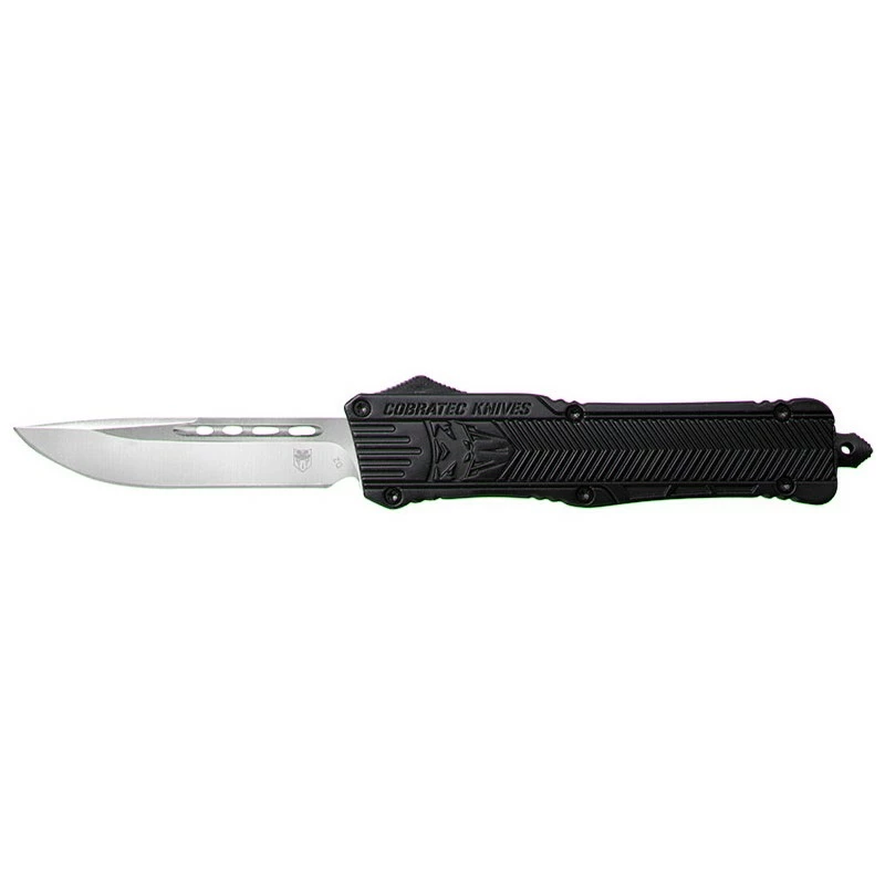 Pour un usage général, le CobraTec Medium CTK-1 OTF Black est sans aucun doute l’un des meilleurs modèles. Ce couteau automatique OTF se révèle être extrêmement simple à transporter en raison de sa longueur de 127mm une fois en position fermée (lame non ouverte). Le manche est ici de couleur noire, avec une fabrication en aluminium de haute qualité, ce dernier est texturé afin d’améliorer toujours un peu plus la préhension. On peut observer l’emblème CobraTec ainsi que l’inscription CobraTec Knives juste au-dessus. Ce couteau automatique OTF est ambidextre car le clip peut être basculé de chaque côté du manche qui fait également office de brise-verre pour les situations d’urgence.