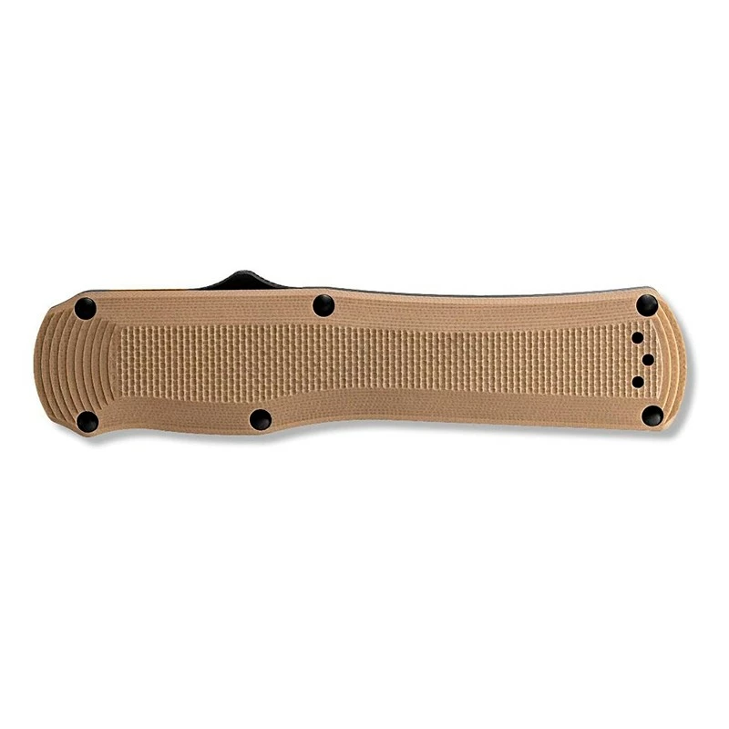 Le Benchmade Autocrat 3400BN_2 se distingue par son manche en G10 coloris désert marron. C’est un couteau à ouverture automatique frontale, type OTF, qui convient parfaitement pour l’usage tactique ou EDC. Soulignons le fait que la poignée en G10 est texturée afin que l’utilisateur puisse la tenir confortablement dans la main. Elle mesure 128mm de longueur, et peut donc être rangée aisément dans une poche, même de petite taille. Sur le côté du manche désert, on peut observer le bouton glissière servant à déployer la lame de 94mm fabriquée en acier inoxydable CPM-S30V. Une lame noire, à double tranchant lisse et à la finition satinée, qui est bien sûr marquée par le logo de la coutellerie Américaine Benchmade. Le couteau automatique OTF Benchmade Autocrat BN3400BK_2 plaît tant pour ses performances que sa légèreté, avec un poids très légèrement supérieur à 110 grammes. Voilà qui confirme une fois de plus l’excellente transportabilité de ce modèle qui existe également en coloris vert olive (voir les accessoires conseillés en bas de page).