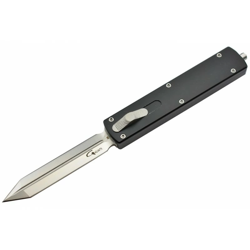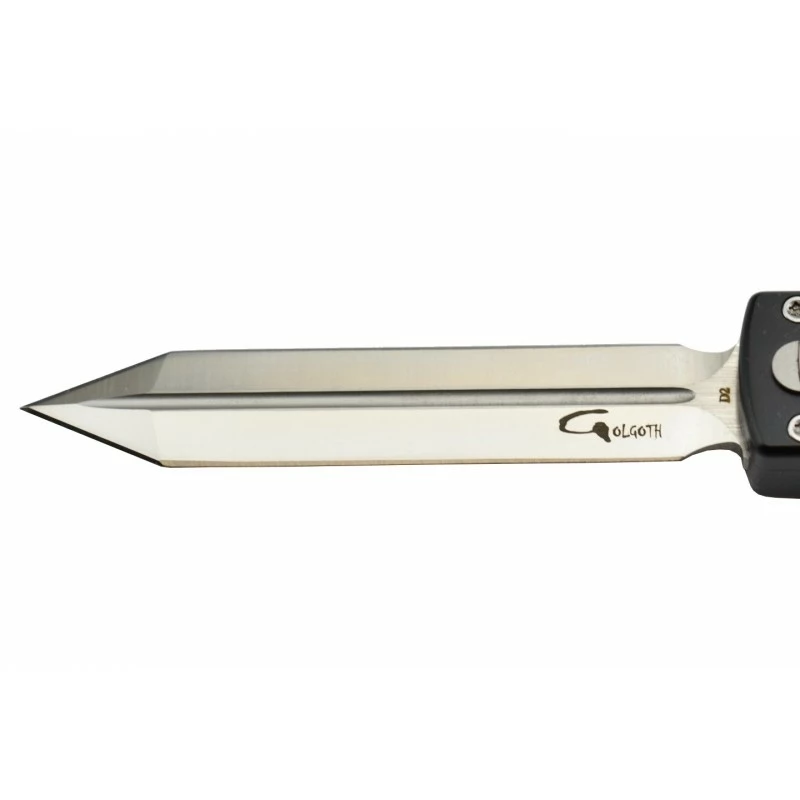 Le Golgoth G12G est un couteau automatique OTF, à ouverture frontale donc, offrant de belles prestations et avec un bon rapport qualité/prix. Il possède une lame glaive au tranchant double, cette dernière a une pointe bien mise en évidence à l’origine d’une forte puissance de pénétration. D’une longueur de 88mm, la lame glaive est fabriquée en acier D2 à la résistance tout simplement excellente. Rainurée au centre, la lame est marquée par le logo Golgoth sur la partie inférieure, dans le coin inférieur droit.
