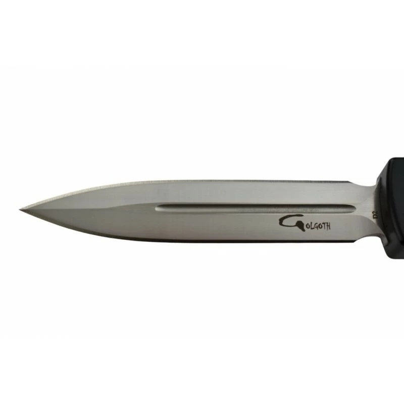 La lame est quand à elle construite en acier D2 à hautes performances, elle est de forme spear point et donc à double tranchant. D’une longueur de 9cm, elle est rainurée au centre et marquée du logo Golgoth sur la partie basse. Gravure possible en option. Vis en titane. Livré dans une pochette en cordura.