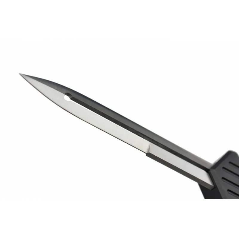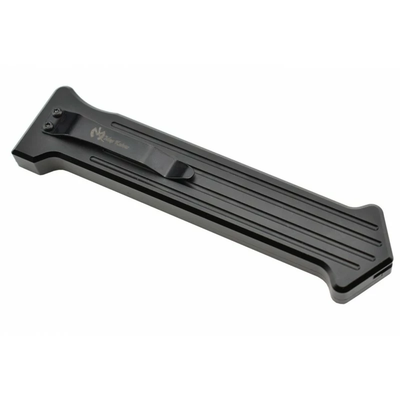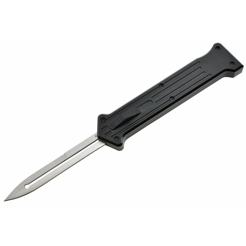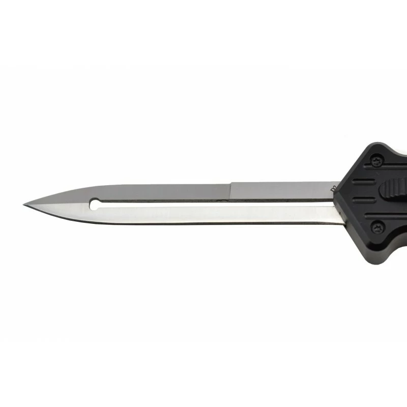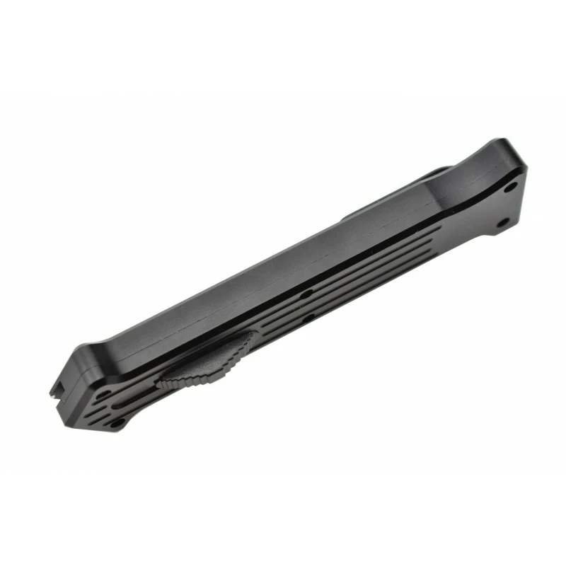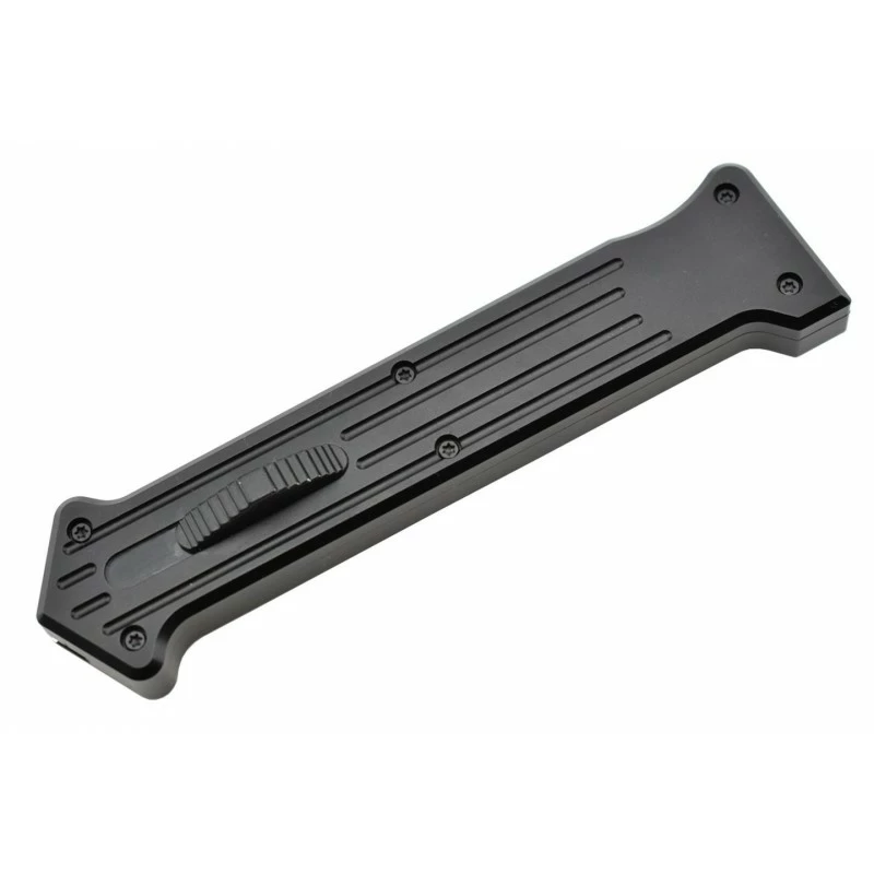 Le Max Knives Joker MKO40 est un couteau automatique OTF, comprenez que la lame s’éjecte par l’avant, droit devant. Mesurant 9cm de longueur, cette dernière est faite d’acier D2, un acier qualitatif offrant d’excellentes performances. Une lame pointue qui est ajourée en son centre par une grande ligne avec extrémité ronde. Un ajour qui fait la différence en terme de style, de design ! La lame se déploie rapidement sous la commande d’un bouton situé sur le manche. Un manche qui est de couleur noire, et fabriqué en aluminium anodisé avec rainures pour l’élégance et l’ergonomie. La facilité de transport est assurée par un clip de poche en acier avec revêtement noir afin d’être en parfaite harmonie avec le couteau automatique, un clip qui est marqué par le logo Max Knives. Le Joker MKO40, un OTF fiable signé Max Knives !
