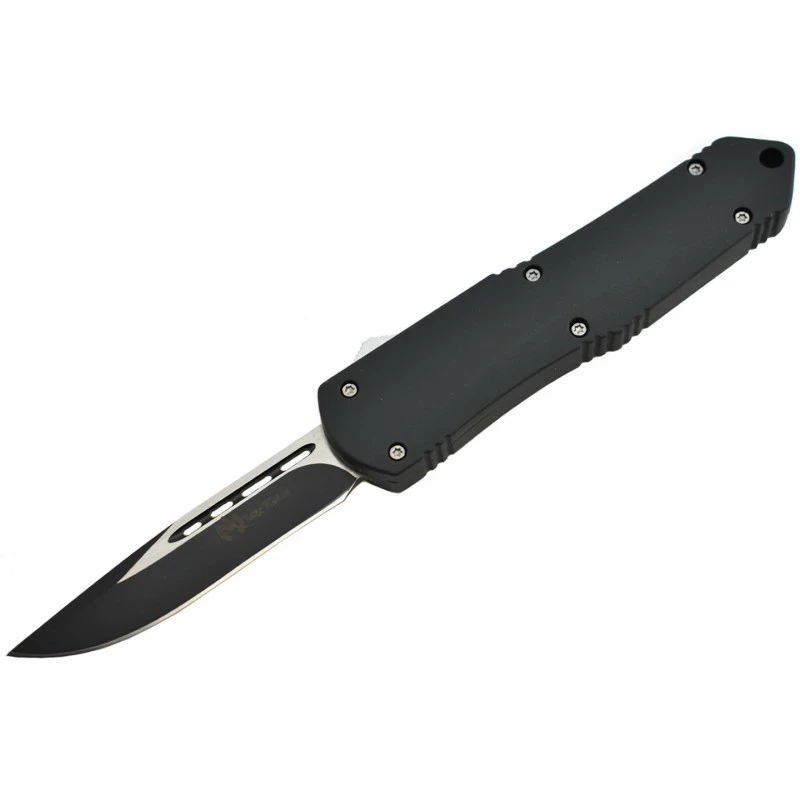 Le Max Knives MKO43 est un couteau automatique à ouverture frontale (OTF) au style tactique. Son manche en aluminium noir de 123mm de longueur est agréable à tenir en main, il intègre un trou pour cordon en bout à l’origine d’une meilleure transportabilité. Sur la tranche de la poignée, on observe un bouton à faire glisser qui permet d’actionner la lame « droit devant ». Livré avec son étui ceinture en nylon afin de toujours conserver le couteau automatique sous la main lors des déplacements.