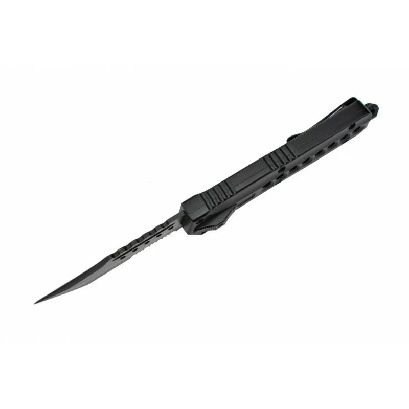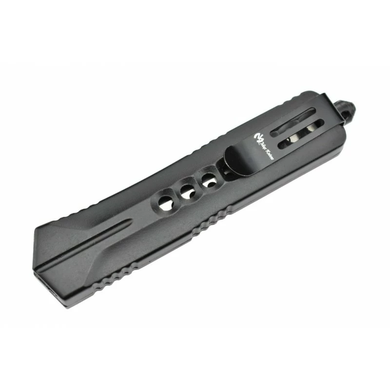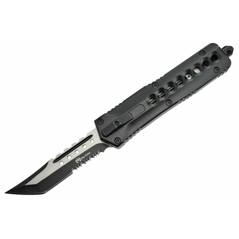 Le Max Knives MKO5 est un couteau automatique OTF muni d’une lame de 9cm de longueur, de forme tanto, et au tranchant semi-dentelĂ©. AjourĂ©e par cinq trous, la lame mixte est grise et noire, ainsi que dĂ©corĂ©e par le logo Max Knives, son tranchant est redoutable.