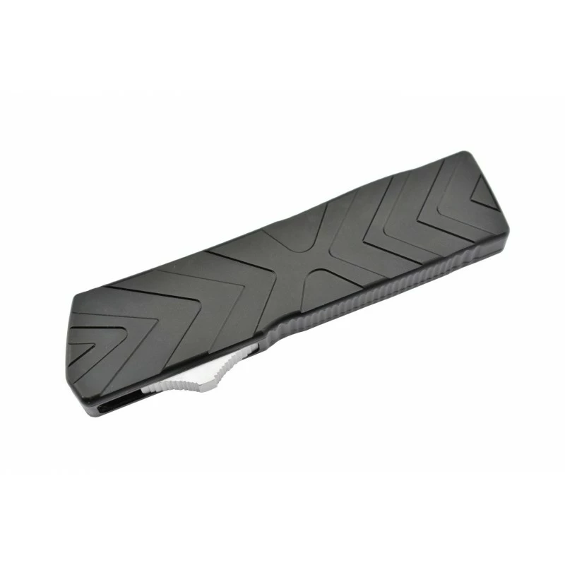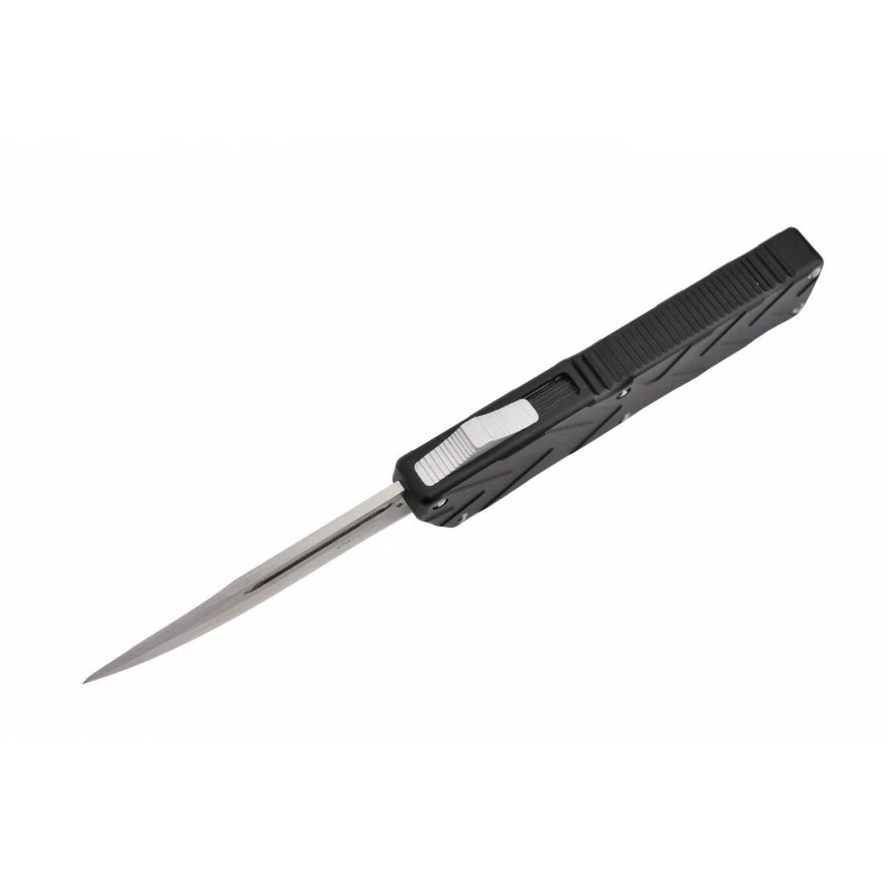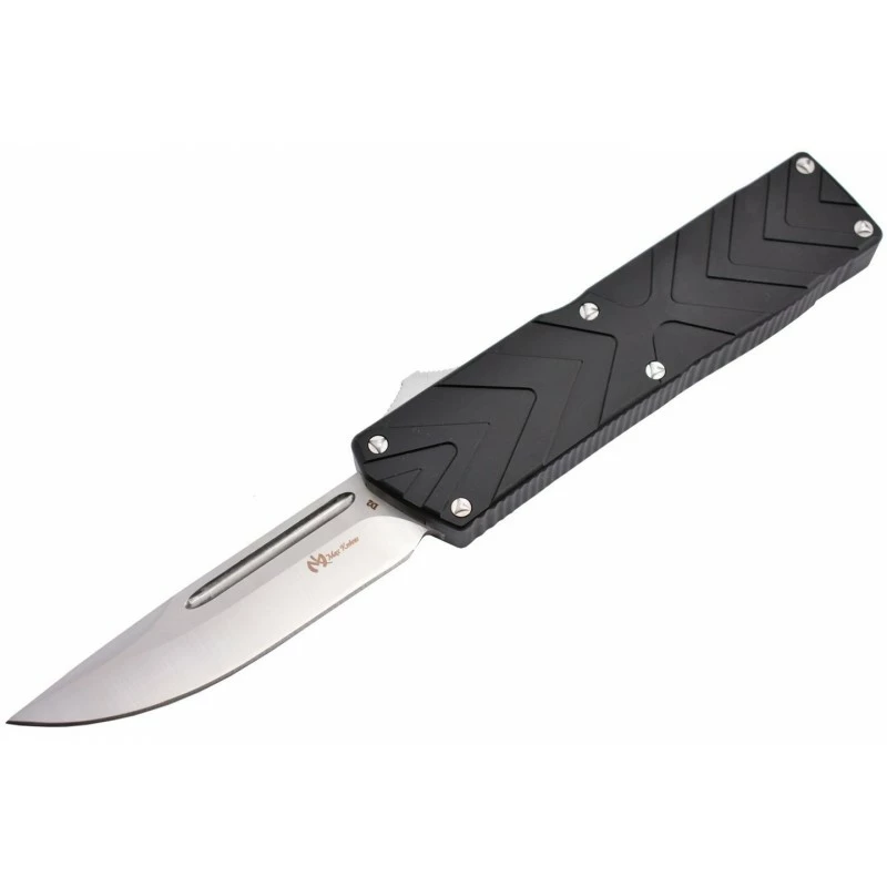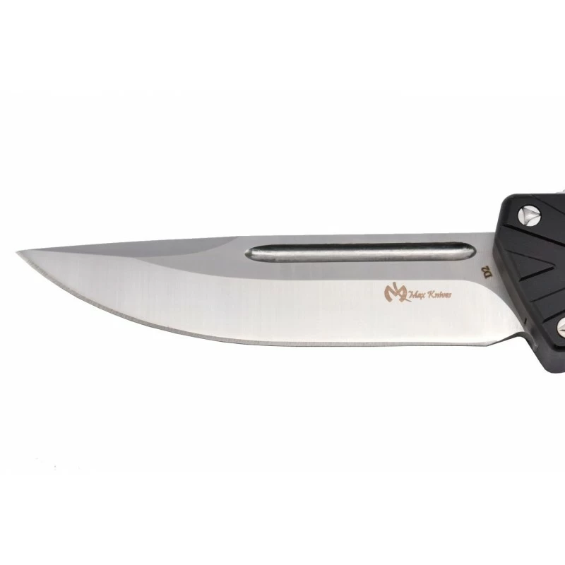 Le MKO6, par Max Knives, est un couteau automatique OTF simple d’utilisation et tellement efficace. Il est doté d’une lame de 84mm de long, en acier D2 résistant à la corrosion et à l’usure, et d’épaisseur 3mm. Marquée par le logo Max Knives, elle peut être gravée par une inscription au choix, pratique pour une identification simple et rapide ou tout simplement dans l’optique d’offrir. L’ouverture/fermeture de la lame est assurée grâce au bouton latéral qui vous l’aurez compris, est situé sur le côté, la tranche du manche de couleur noire en aluminium anodisé. À noter que ce dernier est texturé pour un design beaucoup plus sympathique, attrayant. La poignée noire ne possède pas de clip de poche, mais elle ne mesure que 118mm de long, ce qui permettra un transport simple et sans encombre quotidiennement. D’ailleurs, il faut savoir que ce couteau automatique OTF Max Knives MKO6 est vendu avec son étui ceinture en nylon. Idéal pour toujours le garder près de soi !