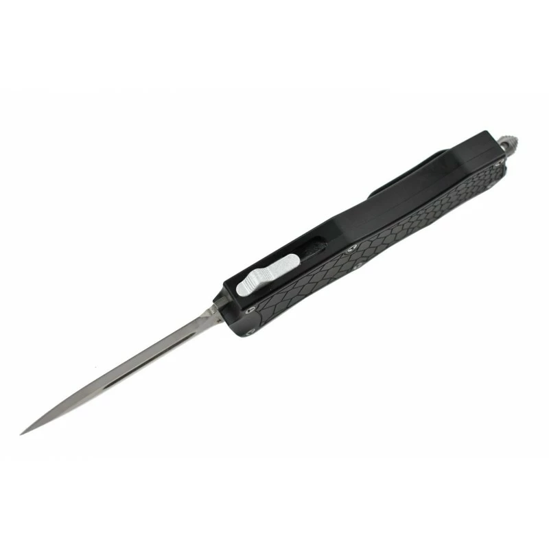 Le Max Knives MKO7DT est un couteau automatique OTF qui se dote d’une lame de 8cm de longueur (épaisseur 3mm) en acier D2, à double tranchant pour des performances optimales. La lame spear point confère une apparence plus agressive, elle est ajourée au niveau du centre par des rectangles à bords arrondis. Le manche est fabriqué en aluminium anodisé noir avec la présence de motifs façon écaille, il mesure 13cm ce qui rend le transport du couteau automatique Max Knives MKO7DT relativement simple. Sur le côté du manche, on observe un bouton coloris gris argent qui vous l’aurez deviné, sert à déployer la lame rapidement afin d’intervenir efficacement en cas de besoin. Avec clip de poche pour la facilité de port et brise-vitre pour l’urgence. Le Max Knives MKO7DT est livré avec son étui de protection ceinture en nylon, parfait pour en prendre soin.