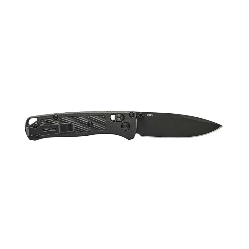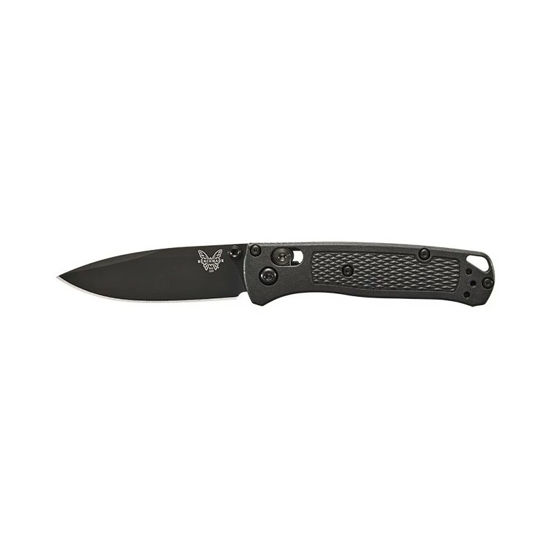 Une main de fer dans un gant de velours, ou plutôt de hautes performances dans un gabarit réduit, voilà les promesses du Mini Bugout 533BK_2. Ce couteau Benchmade Axis Lock est un must pour les tâches quotidiennes. Il se compose d’une lame noire d’environ 72mm de longueur, en acier CPM-S30V, forme drop point avec double thumb stud pour la facilité d’ouverture, de déploiement. La lame est décorée par le papillon Benchmade en blanc, qui ressort ainsi très bien par dessus la couleur noire.