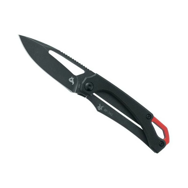 Le couteau Black Fox Racli, de Denis Simonutti, dans sa version entièrement noire, du moins à un petit détail près, qui fait comme d’habitude toute la différence. En effet, le manche de 8cm de long est fabriqué en G10 au recto, et acier inoxydable au verso, avec toutefois une entretoise en aluminium anodisé rouge pour la touche stylée, moderne, qui attire fortement l’attention. Doté d’une jolie finition Blackwash, ce couteau Black Fox Racli BF.745 intègre un clip de poche au dos, rendant les déplacements et mouvements aisés en toutes circonstances.
