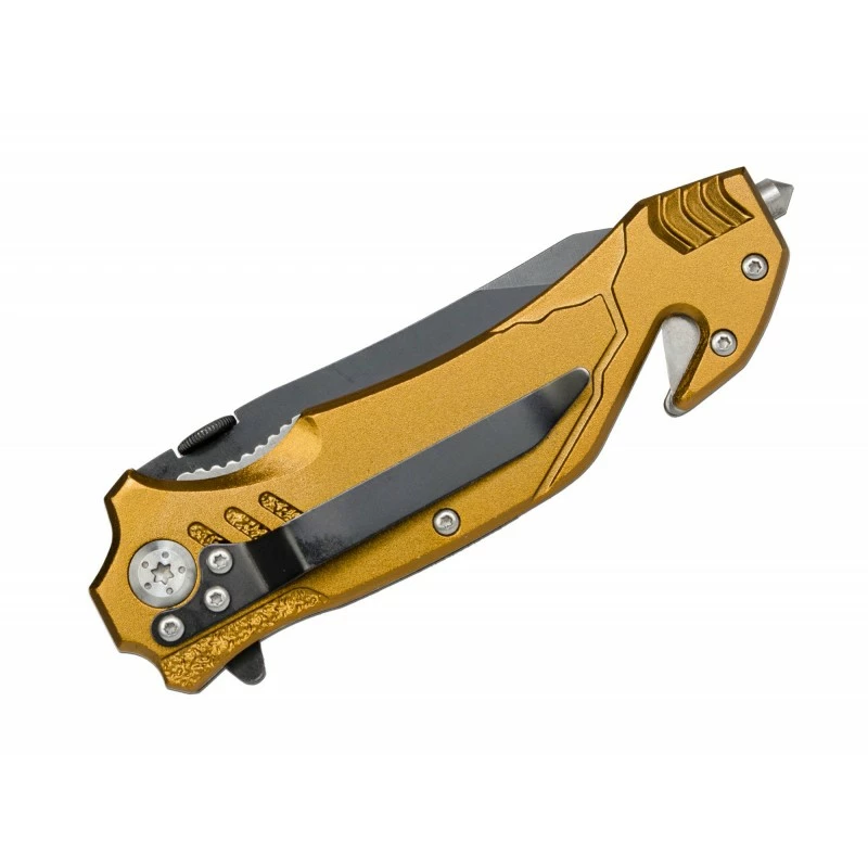 Le Böker Magnum 01LL471, modèle Army Rescue, est un couteau pliant parfaitement adapté pour les opérations de sauvetage, de secourisme. Son manche, coloris imitation or, est fabriqué en aluminium, et décoré par un motif militaire, armée. Très élégant, le manche mesure 122mm de longueur et intègre un clip de poche au dos, autant dire tout de suite que la facilité de port est de mise. En bout de poignée, se trouve un brise-vitre ainsi que coupe-ceinture, des outils affûtés pour les situations d’urgence !