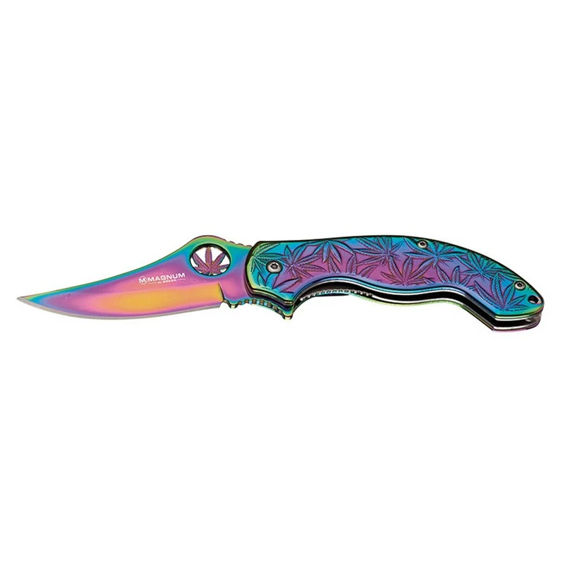 Ce Böker Magnum 01RY977, modèle Colorado Rainbow, attire l’attention en raison de ses couleurs arc-en-ciel sur la lame mais aussi le manche. Un couteau pliant atypique qui ne manquera pas de plaire aux botanistes par ses motifs feuilles de chanvre sur le manche, un motif que l’on retrouve d’ailleurs au niveau de l’ajour de la lame. Nous vous rappelons que cette herbe est légale au Colorado, d’où le nom du couteau.