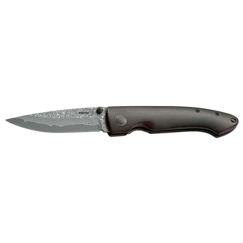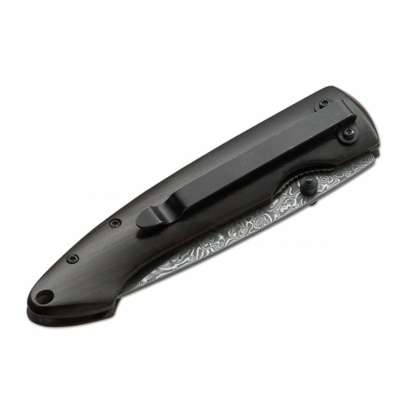 Le Böker Plus Damascus Gent 1 porte la référence 01BO101DAM. C’est un couteau de gentleman au style particulièrement raffiné : difficile de le croiser sans l’apercevoir. Il se compose d’une lame de 82mm de longueur au look percutant en raison de sa fabrication en damas, ceci explique la présence de jolis motifs. La lame est en parfaite harmonie avec le manche en bois d’ébène caractérisé par sa couleur sombre ou encore foncée. Un clip est présent au dos de la poignée, il se fait discret mais permet de transporter beaucoup plus facilement le couteau Böker Plus Damascus Gent 1. Un passe-lacet ou cordon est de la partie au niveau de l’extrémité.
