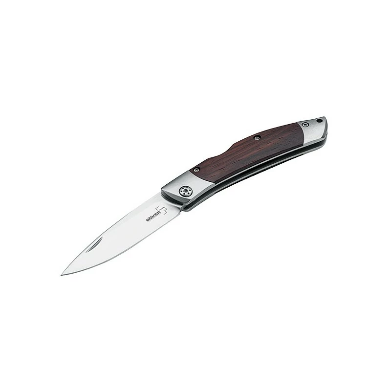 Le Böker Plus Caballero est un couteau pliant très compact : son petit gabarit et sa légèreté font qu’il se range facilement à l’intérieur d’une poche de pantalon ou de gilet. Le manche se compose d’une partie centrale en bois cocobolo ainsi que deux mitres en acier inoxydable brossé au niveau des extrémités. Autant dire que cela vient parfaire à merveille le look du Caballero ! Afin que vous puissiez le transporter plus facilement au quotidien, il intègre un trou pour lanière au bout de la poignée.