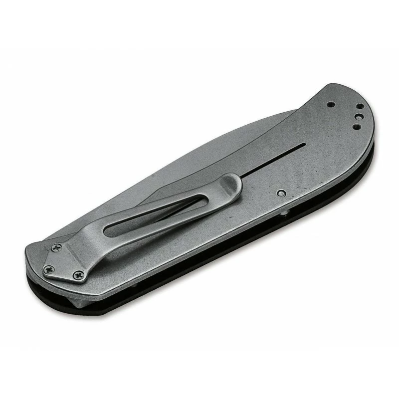 Le Böker Plus Exskelibur II Framelock Steel est un couteau utilitaire conçu par le designer sud-africain Mike Skellern. Son frame lock n’est pas fabriqué en titane, mais en acier inoxydable, ce qui permet de réduire les coûts tout en conservant le populaire design plat. Le manche mono-plaquette est fabriqué en G10 noir à l’origine d’une grande résistance et d’une très confortable prise en main. Côté transport, aucune inquiétude à avoir puisque le couteau intègre un clip repositionnable sur l’autre face.