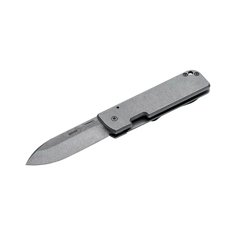 C’est le designer ukrainien Serge Panchenko qui est à l’origine de la conception du couteau Böker Plus Lancer 42. Un modèle facilement transportable en raison de son design ultra-plat et compact, son manche gris en acier inoxydable dispose d’une belle finition délavée robuste. On peut observer que la poignée est ajourée d’un trou sur le côté, et qu’elle intègre un clip de poche tip-up au verso. Côté transport, vous ne rencontrerez pas la moindre difficulté, il faut dire que le couteau Böker Plus Lancer 42 Steel se glisse n’importe où en raison de sa faible taille (longueur de 92mm en position fermée). Une petite ouverture ronde en bout de manche permet également de l’accrocher aisément avec de la fine corde par exemple.