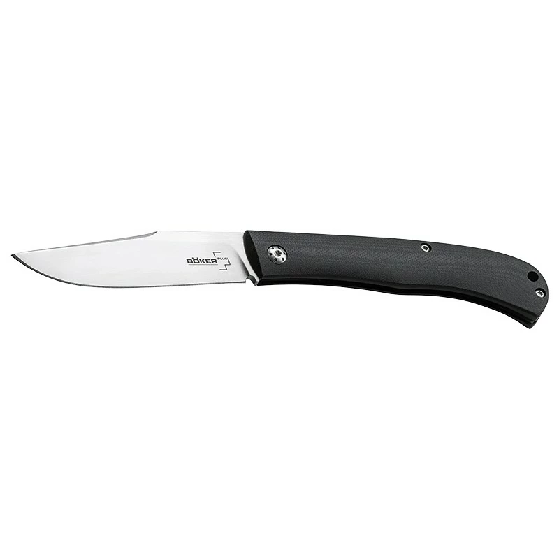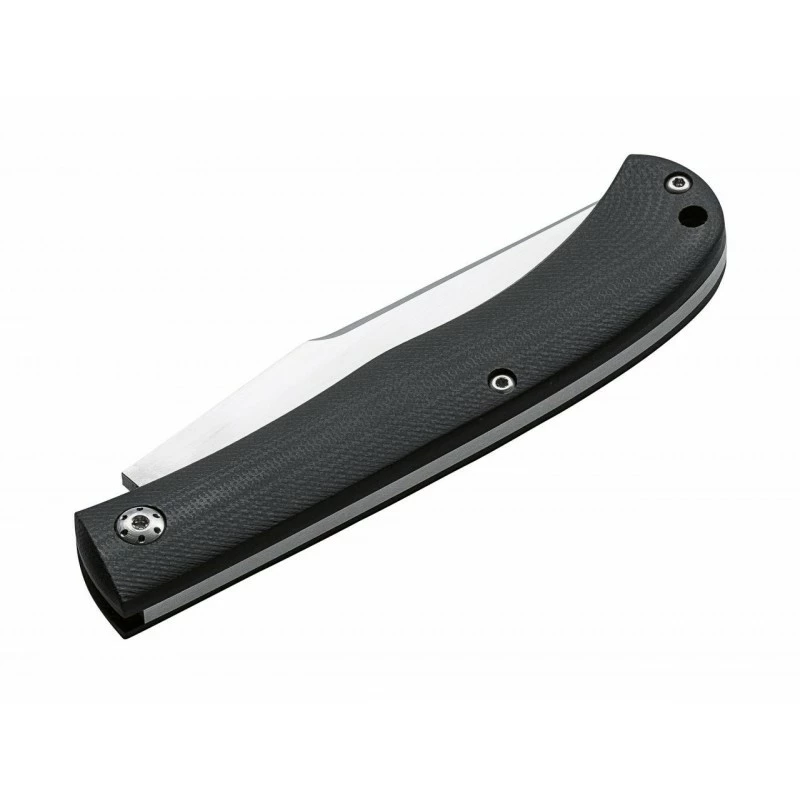 Le couteau Böker Plus Slack référence 01BO065 est conçu par le designer Français Raphael Durand. C’est un couteau de poche à mécanisme slipjoint doté d’une lame de 82mm en acier inoxydable VG-10, avec marquage du logo Böker Plus. Une lame qu’il est possible de personnaliser par gravure au niveau des deux faces (voir bouton ci-dessous). Le Böker Plus Slack, c’est aussi un joli manche en acier inoxydable recouvert de plaques en G10 noir. Un manche comprenant des trous pour la touche design, mais aussi pour rendre le couteau pliant plus léger, et donc plus confortable à utiliser au quotidien. Pour information, le manche mesure précisément 104mm de longueur, il tient donc parfaitement dans la main et assure une facilité de transport. Un couteau de poche Allemand qui bénéficie de la « French Touch« , la touche Française apportée par le designer Raphael Durand.