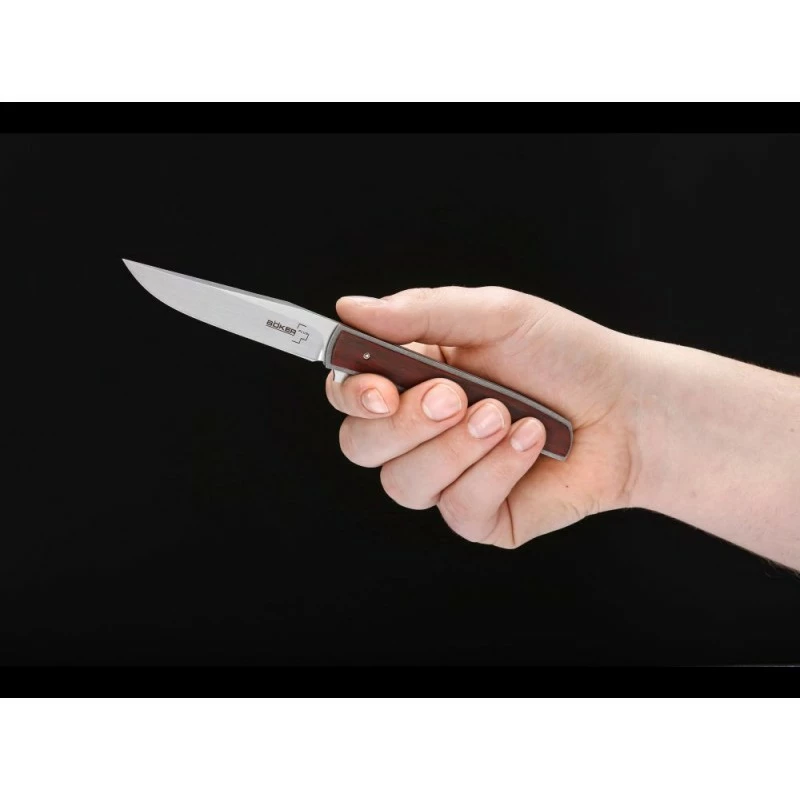 Le Böker Plus Urban Trapper 01BO734 est un couteau de poche gentleman conçu par Brad Zinker. Sa particularité, c’est sa conception extrêmement plate associée à des matériaux raffinés tels que l’acier inox VG-10 pour la lame ou encore le bois cocobolo pour le manche. Un couteau à mécanisme Liner Lock qui plaira aux utilisateurs les plus exigeants ! Le Böker Plus Urban Trapper 01BO734 se veut très transportable en toutes circonstances, il faut dire que le manche en bois cocobolo ne mesure que 108mm de longueur. La lame de 87mm est personnalisable par gravure, on peut déjà observer la présence du logo Böker Plus (coutellerie Allemande). À noter que la lame peut être déployée rapidement et d’une seule main à l’aide du flipper. Élégance, légèreté, performances : le couteau EDC Böker Plus Urban Trapper Cocobolo a tout pour vous séduire !