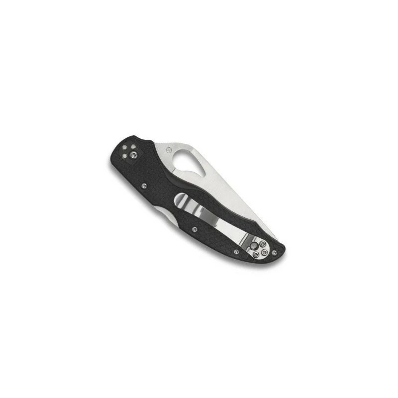 Ce couteau Byrd Knife Harrier 2 dispose également d’une lame semi-dentée fabriquée en acier 8Cr13MoV à cran, elle est à profil plat. À la fois lisse et crantée, la lame mesure 85mm de longueur, elle est également ajourée par une forme « géométrique » ce qui confère une certaine dose d’élégance. Possibilité de gravure sur lame, rappelons que ce couteau Byrd Knife BY01PSBK2 est conçu sous le strict contrôle de la marque Spyderco.