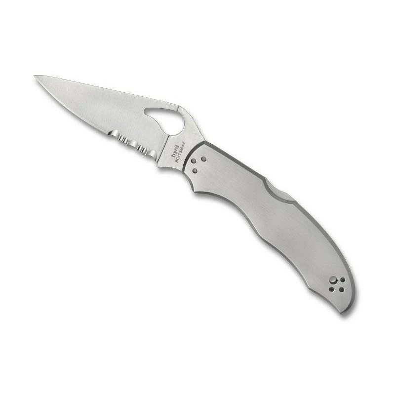 Ce couteau Byrd Knife, par Spyderco, porte la référence BY01PS2. Il s’agit de la version « lame mixte » du modèle Harrier 2. Par cela, il faut entendre que la lame de 86mm, toujours fabriquée en acier inox 8Cr13MoV, comprend un bord lisse ainsi qu’un bord à dents. Le tranchant lisse est utile pour réaliser des tâches précises, minutieuses, tandis que le tranchant denté sera plutôt utilisé pour les opérations nécessitant de la puissance de coupe. Se verrouillant grâce au verrouillage back lock, la lame est ajourée par une forme originale et non ronde comme c’est souvent le cas chez Spyderco. Ne pas oublier qu’il est envisageable de graver la lame en supplément.