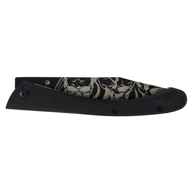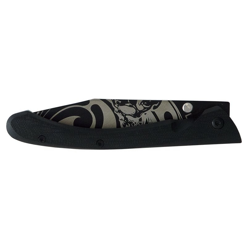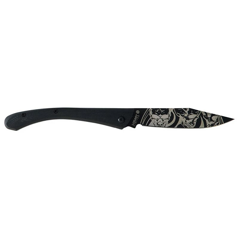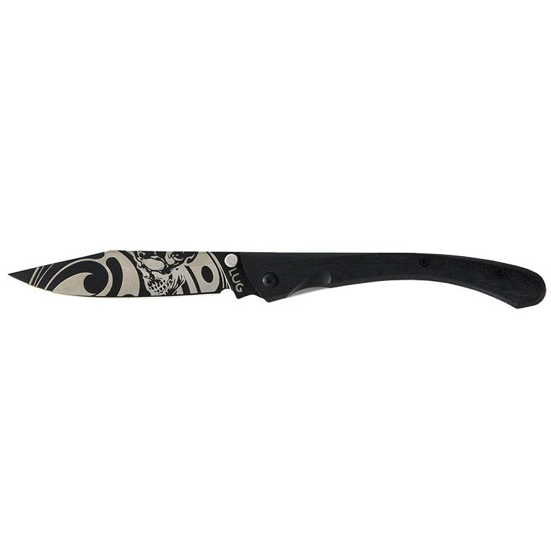 Ce couteau pliant LUG C63, design Cyril Ganivet, s’intitule « Bad Boy » ou encore « mauvais garçon » si vous prĂ©fĂ©rez. Sa lame de 8cm de longueur est construite en acier inoxydable 7Cr17MoV et comporte un revĂŞtement en titane noir PVD. Cette dernière est gravĂ©e au laser de tatouages de motifs tĂŞte de mort, un esthĂ©tique qui interpelle ! Les tatouages sont prĂ©sents sur les deux faces de la lame.