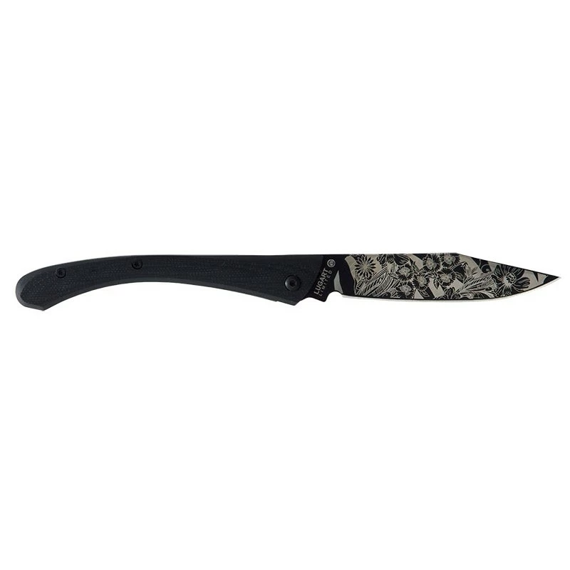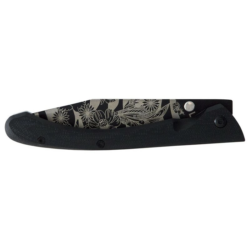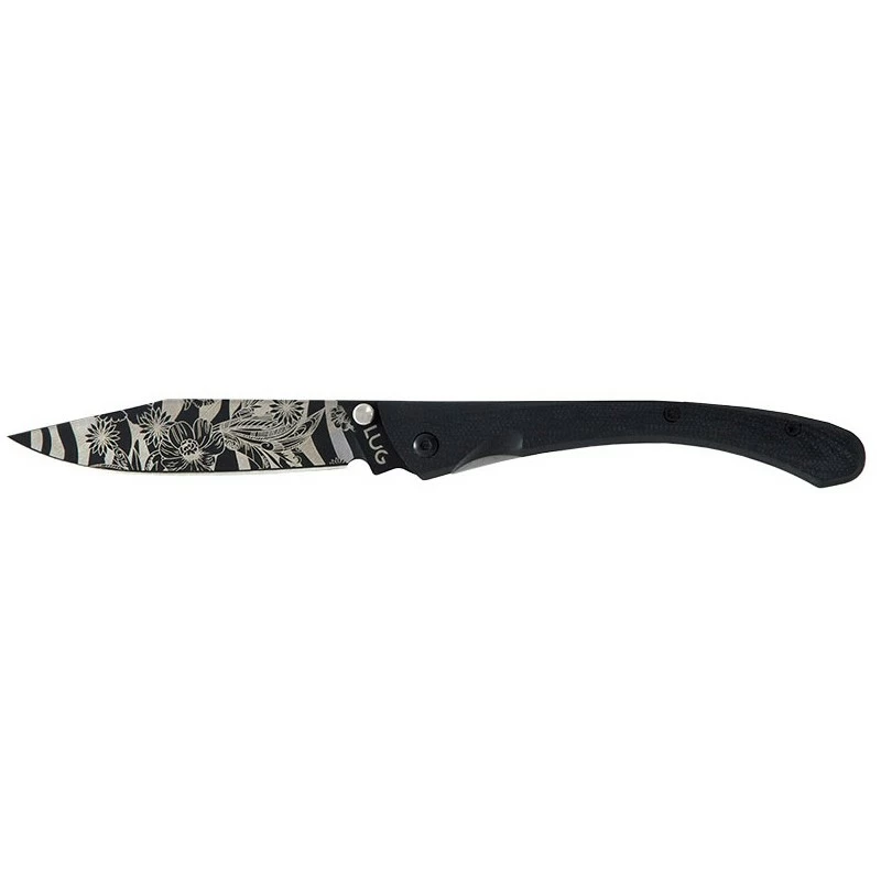 Celles et ceux qui apprécient la beauté de la nature, et plus particulièrement des fleurs, risquent de fortement apprécier le couteau C63 de la marque Française LUG. Un couteau pliant plein d’élégance, de modernité, qui possède une lame de 8cm en acier 7Cr17MoV ayant la particularité d’être tatouée au laser par de beaux motifs floraux au niveau des deux faces. Le verrouillage de la lame s’effectue par le biais du mécanisme frame lock, finition revêtement titane noir PVD.