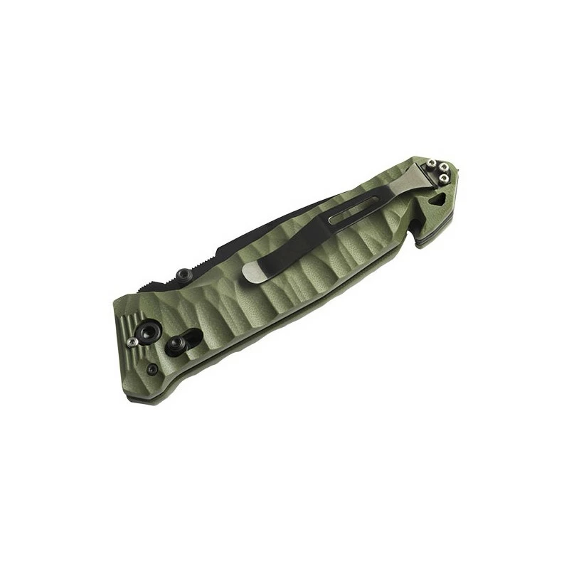 Utilisé par l’armée française (au moins jusqu’en 2022), le couteau pliant CAC S200 comprend un manche en PA6 chargé en fibre de verre d’un beau coloris kaki. Ce dernier est caractérisé par une jolie texture craquelée ergonomique. Un clip ceinture réversible noir est présent au dos de la poignée, il améliore grandement la transportabilité.