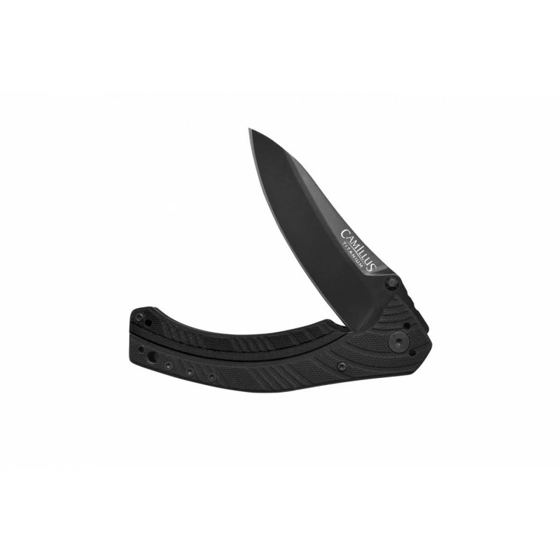 Le Vanish de chez Camillus, rĂ©fĂ©rence 19317, est un couteau pliant, de poche, au design sombre : nul doute qu’il plaira Ă celles et ceux apprĂ©ciant les couteaux noirs ! Ce modèle possède une lame de 82mm en acier AUS-8 avec traitement titane ce qui confère une duretĂ© maximale (jusqu’Ă 10 fois plus durs qu’un acier non traitĂ©). La duretĂ© Rockwell est la suivante : HRC56. Il est bon de prĂ©ciser que la lame noire est marquĂ©e par l’inscription Camillus Titanium en blanc, elle ressort ainsi Ă la perfection.