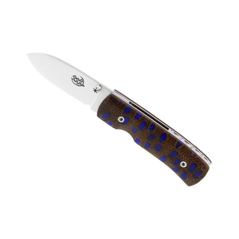 Le Citadel Stavanger 63123 est un couteau de poche extrêmement élégant et performant. La première chose qui saute aux yeux en regardant le couteau, c’est son manche en noix de banksia avec inclusion de résine bleue/intercalaires rouges, ressort guilloché. Cela procure au manche un look très décoratif, dans l’ère du temps. Pour information, le manche mesure précisément 95mm de longueur pour une facilité de transport en toutes circonstances. Rappelons également que ce couteau Citadel Stavanger 63123 est livré avec sa pochette de protection en nylon : parfaite pour prendre soin de son couteau préféré au quotidien. Ce modèle, c’est aussi une lame en acier N690Co à cran intérieur et à bouton (verrouillage Liner Lock). Une lame tranchante qui est décorée par le logo de la coutellerie Citadel : vous pouvez également ajouter vos propres personnalisations, à savoir des textes à graver. Rappelons aussi que ce couteau de poche Citadel Stavanger est fabriqué de façon 100% artisanale au Cambodge.