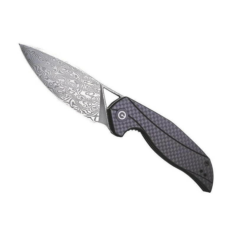 Conçu par le designer Elijah Isham, le couteau Civivi Anthropos C903DS est pour le moment le seul de la gamme à posséder une lame en acier damas (longueur 82mm). Un acier de très haute qualité que l’on reconnaît très facilement en raison de ses multiples motifs. Petite précision qui a son importance, la lame damas est ajourée d’une forme triangulaire à proximité du manche : cela apporte du style au couteau Civivi Anthropos C903DS ! L’ouverture de lame se fait très facilement grâce au flipper ainsi qu’au mécanisme ball bearing : le verrouillage est assuré grâce au liner lock (cran intérieur). Toujours très confortable à manipuler, le manche est fabriqué en acier inoxydable avec plaquettes en G10 noir et inserts en fibre de carbone noir, entretoise G10 noir. Pour que la transportabilité soit toujours excellente, le manche ne mesure que 105mm de longueur et intègre au dos un clip noir en inox. De façon à ce que votre couteau Civivi Anthropos damas soit toujours à vos côtés !