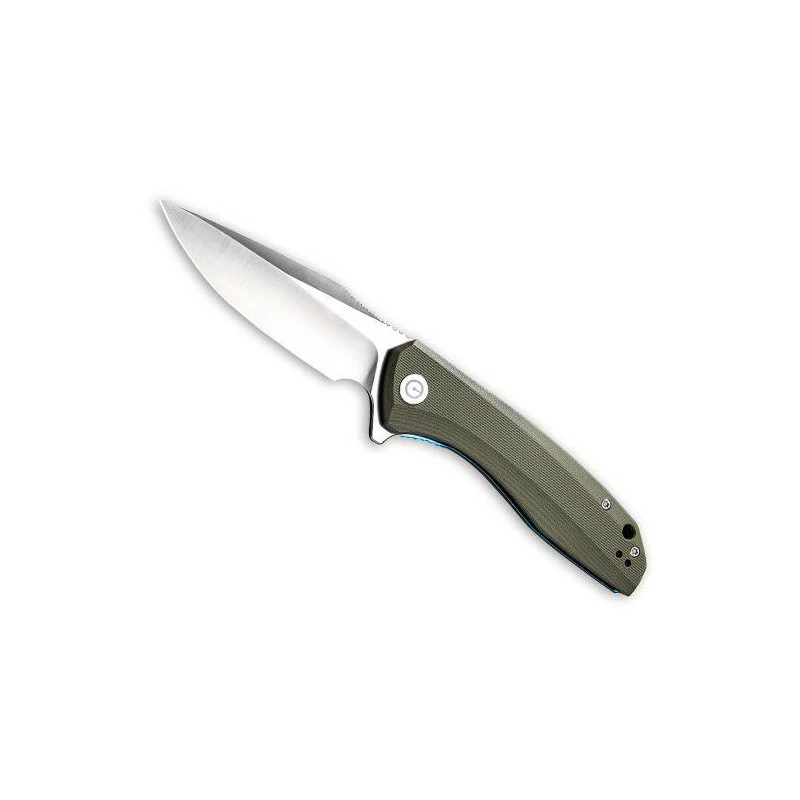 Nous sommes ici en présence du couteau pliant Civivi Baklash C801A caractérisé par un manche habillé de plaquettes et entretoise en G10 vert (base en acier inoxydable bleue). Cela procure une forte dose de modernité au couteau ainsi qu’une excellente transportabilité (longueur du manche 115mm avec clip réversible en acier). Le Civivi Baklash vert est un couteau de poche, qui comme son nom l’indique, pourra être glissé aisément dans une poche afin de toujours l’avoir sur soi en cas de besoin. Ce modèle C801A possède aussi une lame de 89mm en acier 9Cr18MoV satiné avec flipper, mécanisme ball bearing et cran intérieur (verrouillage liner lock). Une lame au tranchant lisse qu’il est d’ailleurs possible de personnaliser par gravure (voir bouton ci-dessous). À noter la présence du logo Civivi au niveau du manche vert, le Baklash est disponible en d’autres coloris.