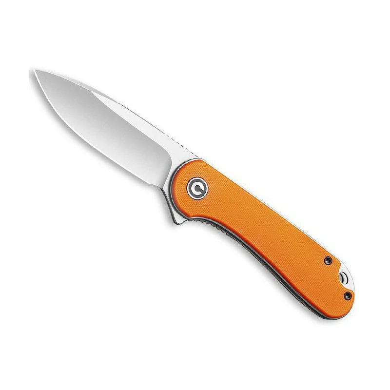 En raison de son manche de couleur orangée, difficile de passer à côté de ce couteau Civivi Elementum C907R sans le remarquer. Mesurant 10cm de longueur, son manche est fabriqué en acier inox gris avec plaquettes en G10 orange, il comprend également le logo Civivi qui est particulièrement décoratif. Agréable à tenir en main, la poignée comporte aussi un clip noir en acier inoxydable, résistant à la corrosion, au dos, il permet bien sûr de transporter le couteau avec aisance. N’oubliez pas qu’une pochette en nylon noir est fourni avec le couteau, afin d’en prendre soin au quotidien.