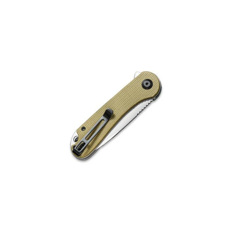 Le coloris olive est un vert assez clair, qui a de nos jours, beaucoup de succès. Une couleur qui fait bien sûr référence au fruit que l’on aime déguster à l’heure de l’apéritif par exemple. Porteur de la référence C907S, ce couteau Civivi, modèle Elementum, possède justement un manche en acier inoxydable gris avec plaquettes en micarta vert olive, il y a aussi le logo Civivi décoratif. Un clip en acier inox noir au dos vient parfaire l’ensemble, il permet bien entendu de pouvoir transporter le couteau pliant avec toujours plus de facilité, d’aisance.