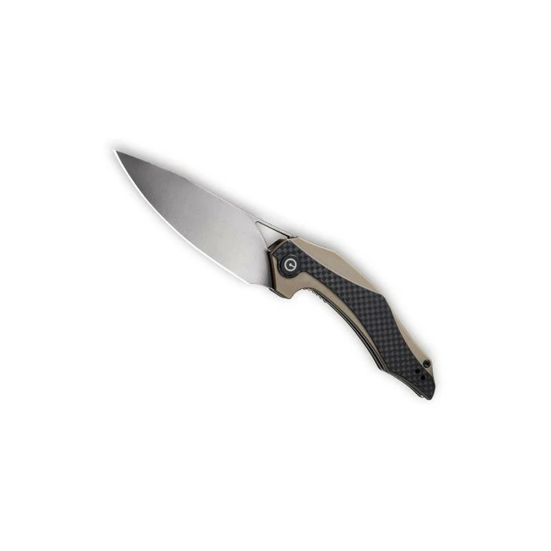 Voici l’incontournable couteau pliant Civivi Plethiros, rĂ©fĂ©rence C904A, oĂą le manche est fabriquĂ© en acier inoxydable avec plaquettes en G10 coloris brun et inserts en fibre de carbone noir. Le rĂ©sultat est plus qu’Ă la hauteur des espĂ©rances de la marque, car la poignĂ©e est Ă la fois design, ergonomique et transportable grâce Ă sa longueur de seulement 115mm. Le petit dĂ©tail qui fait toute la diffĂ©rence, c’est la prĂ©sence du logo Civivi au niveau de l’insert fibre de carbone. Un logo très visible en raison de l’excellent contraste blanc sur noir ! On notera Ă©galement la prĂ©sence d’un clip de poche en titanium noir au dos.