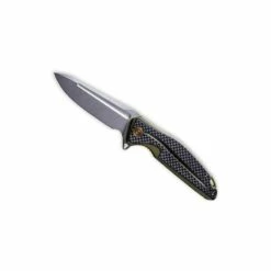 Le couteau Civivi Statera rĂ©fĂ©rence C901B dont le manche en acier inoxydable dorĂ© est cette fois-ci habillĂ© de plaquettes en G10 vert avec inserts en fibre de carbone noir. On peut dire qu’il est hyper Ă©lĂ©gant et toujours autant facile Ă transporter grâce au clip noir en titanium. De toute façon, il faut savoir que le manche ne mesure que 12cm ce qui assure un transport toujours très facile en glissant simplement le couteau dans la poche. Tous les dĂ©placements sont vraiment aisĂ©s, mĂŞme avec le couteau Civivi Statera vert/noir, il faut dire qu’il ne pèse qu’Ă peine plus de 100 grammes.