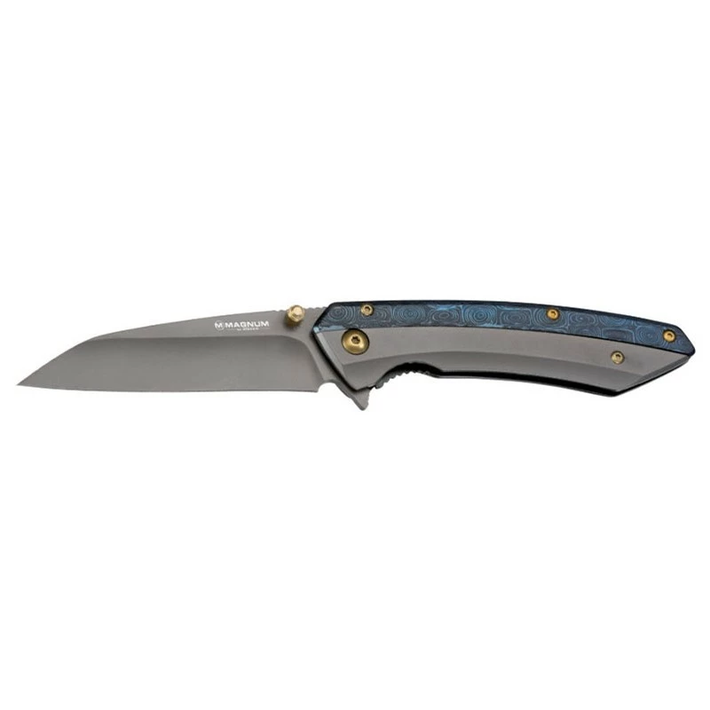 Le couteau Böker Magnum Cobalt est très réussi d’un point de vue esthétique, il comprend de nombreux motifs coloris imitation or (doré) conférant ainsi la petite touche luxueuse faisant la différence. Le bouton de pouce (double thumb stud) est lui aussi doré, et permet de déployer la lame plus facilement. La lame de 88mm peut être ouverte d’une seule main via le flipper qui après ouverture, pourra agir comme protège-main. La lame est sécurisée de façon fiable par le liner lock, sans doute le mécanisme de verrouillage le plus populaire en coutellerie.