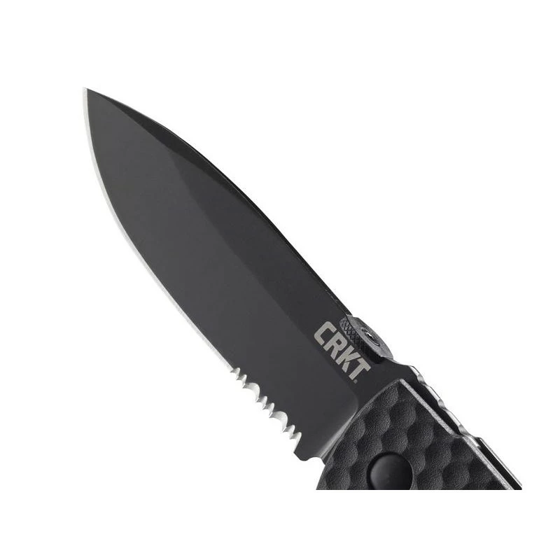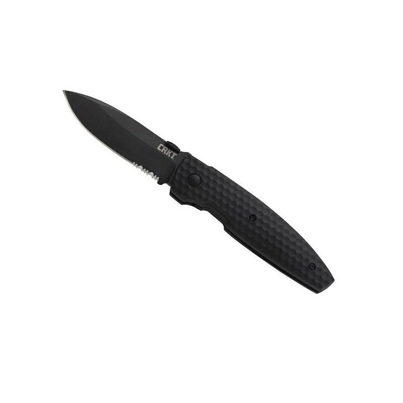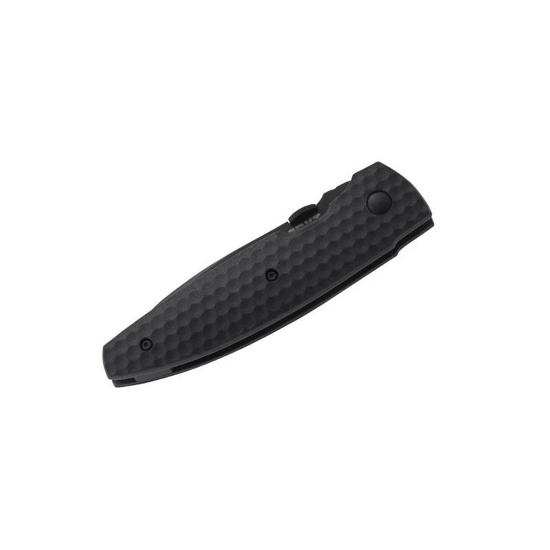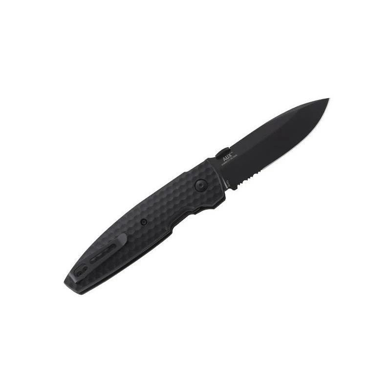 Ce couteau CRKT Aux est entièrement noir ! Il est doté d’une lame noire à dents en acier 8Cr13MoV à cran intérieur et à bouton plat. Le manche est en nylon et fibre de verre noir avec clip et mesure 11cm de longueur.