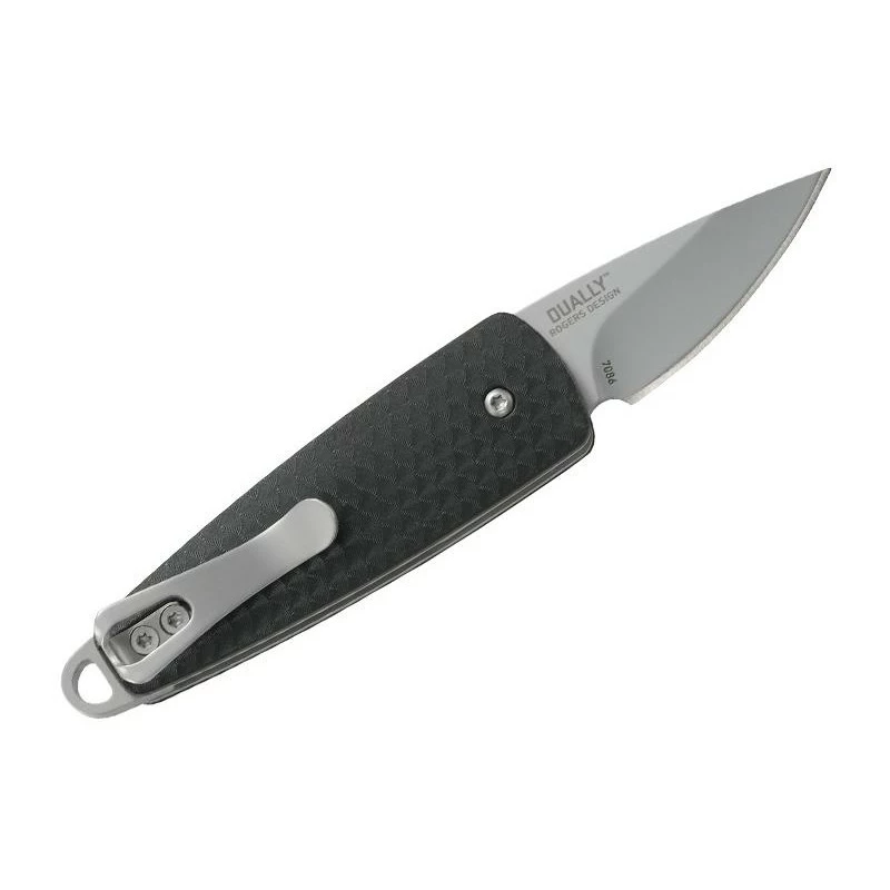 Le couteau double usage CRKT Dually est doté d’un manche en nylon renforcé à la fibre de verre, il est petit mais robuste, alors ne vous fiez pas à sa taille. Vous apprécierez aussi la présence, en bout de manche, d’un trou de lanière pour porte-clés, ainsi le CRKT Dually sera en permanence à vos côtés. Clip de poche gris au dos, finition de la lame : bead blasted.