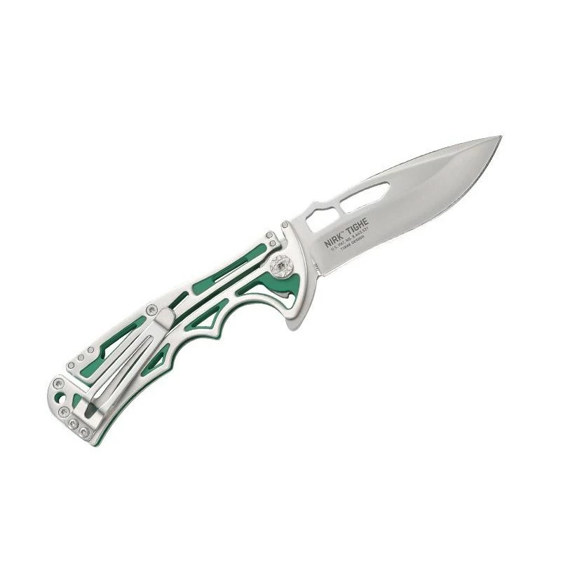 Le Nirk Tighe 5241.CR porte le nom de son créateur, un certain Brian Tighe. Ce couteau CRKT est très moderne, notamment grâce à son manche squelette tout acier, bicolore, avec corps en nitrure de titane verdi. La poignée comprend de nombreux ajours de différentes formes, ce qui renforce le côté design, spectaculaire. Un clip de poche est présent pour sécuriser le transport du couteau au quotidien.