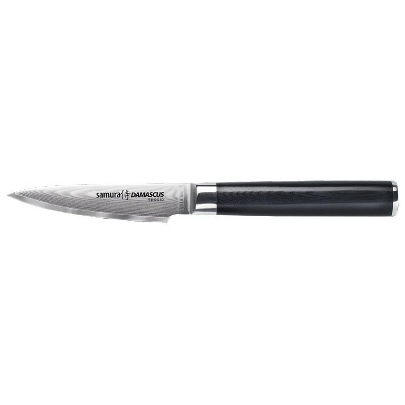 Le Damascus Samura est un beau couteau d’office avec lequel vous prendrez plaisir Ă travailler. Son design Ă©quilibré lui assure une efficacitĂ© de coupe optimale et un maniement aussi confortable qu’aisĂ©. Aussi Ă©lĂ©gant soit-il, le couteau japonais Damascus Samura est avant tout un redoutable objet tranchant qui vous permettra de dĂ©couper les aliments les plus fragiles avec la plus grande nettetĂ©. Sa lame de 90mm de long, forgĂ©e Ă partir de 67 couches de damas, jouie d’une robustesse et d’une rĂ©sistance extrĂŞmes. Ce matĂ©riau de qualitĂ© supĂ©rieur se distingue Ă©galement par son formidable tranchant, sans oublier Ă©videmment son esthĂ©tisme unique. Son manche ergonomique ovale confectionnĂ© en G10 noir est mis en valeur par la mitre et le pommeau mĂ©talliques respectivement placĂ©s sur chacune de ses extrĂ©mitĂ©s. Aussi agrĂ©able Ă regarder qu’Ă tenir, il procurera de bonnes sensations Ă l’utilisateur. Le couteau de cuisine Damascus Samura est un excellent choix pour Ă©quiper votre cuisine !