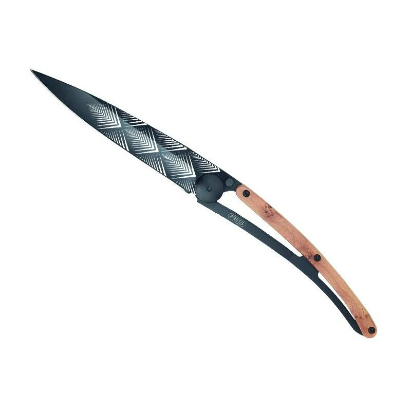 Un poids plume de 37 grammes, une fine lame noire de 9.5 cm de longueur en acier 420 à cran type « Liner lock » décorée de beaux motifs abstraits blancs, c’es le couteau Deejo Black TATTOO « Art déco ». Son clip de ceinture intégré le rend très facile à transporter en toutes circonstances. Côté manche, vous pourrez compter sur un magnifique manche squelette de 11 cm de longueur orné d’une plaquette en loupe de genévrier : un manche très design que vous allez adorer regarder et surtout prendre en main.