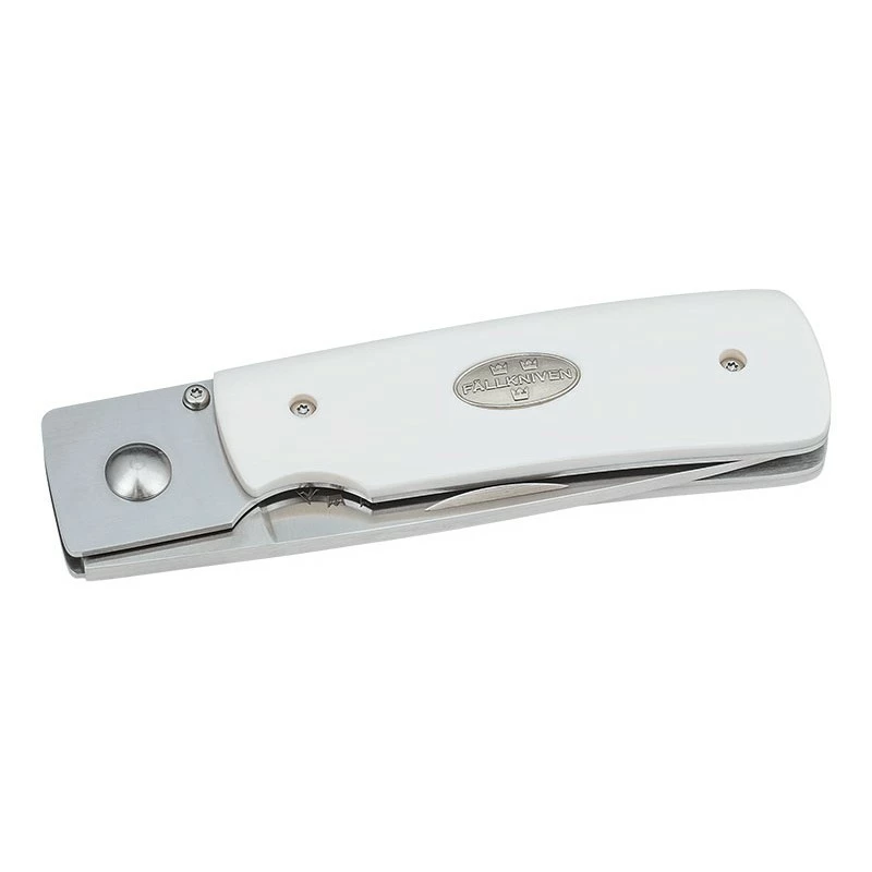 Le Fällkniven RL1 est un couteau pliant ici doté d’un manche en elforyn, un matériau imitant à merveille l’ivoire. Sa lame de forme drop point est fabriquée en acier elmax Suédois, pour information le durcissement a été réalisé en partenariat avec « Uddeholm Sweden », une pointure dans le milieu de l’acier. Cela garantit des performances de coupe maximales ! La lame a un bord convexe offrant une excellente résistance, un liner lock soigneusement réalisé permet d’utiliser le couteau en toute sécurité. La longueur de la lame est de 7cm tandis que le manche lui mesure 95mm à l’origine d’une facilité de transport permanente. La lame est enrichie de l’inscription « Fällkniven RL1 Elmax », le manche est lui aussi décoré par le logo de la marque Suédoise. Couteau livré avec son étui daim, existe aussi en version desert ironwood.