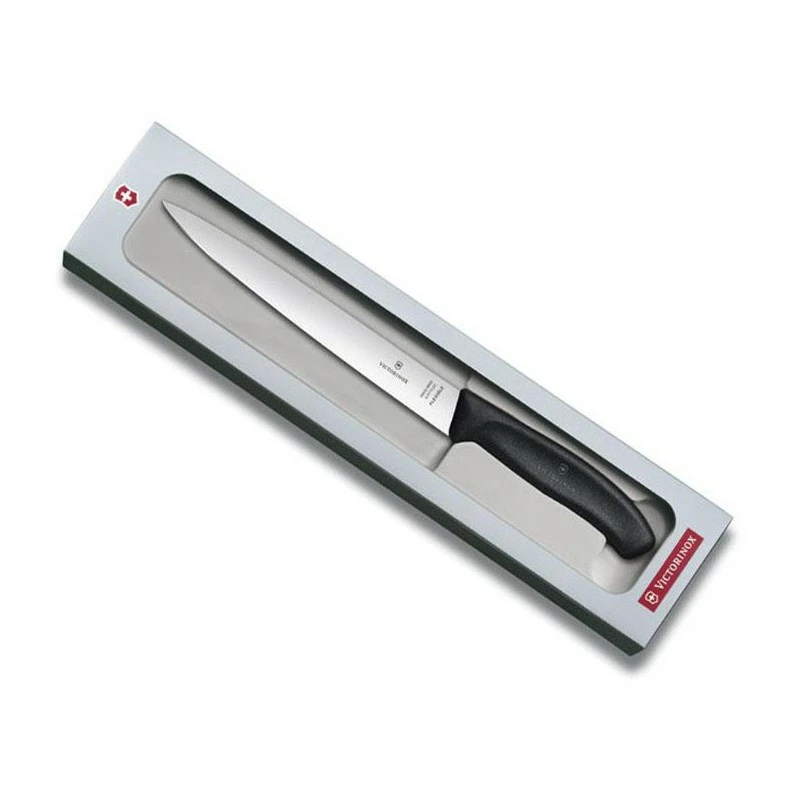 Avoir un poisson appétissant entre les mains, c’est bien, savoir le préparer dans les règles de l’art, c’est encore mieux. Pour transformer facilement vos poissons en filets, rien de plus simple, utilisez ce couteau filet de sole Victorinox, série SwissClassic. Il possède une lame souple et flexible mesurant 20cm de longueur, la fabrication en acier inoxydable garantit un tranchant de qualité, tout comme la résistance à la corrosion d’ailleurs. Bonne nouvelle, il vous est possible de personnaliser la lame via le bouton ajouter une gravure ci-dessous. Sur ce couteau filet de sole Victorinox SwissClassic 6.8713.20G, l’ergonomie est au rendez-vous grâce au manche noir en polypropylène à la surface antidérapante. Autre avantage, l’entretien est extrêmement facile, ou plutôt le nettoyage, en raison de la compatibilité avec le lave-vaisselle. Bien présenté dans une belle boîte cadeau, ce couteau de cuisine Victorinox ne manquera pas de faire les beaux jours de celles et ceux appréciant le poisson !