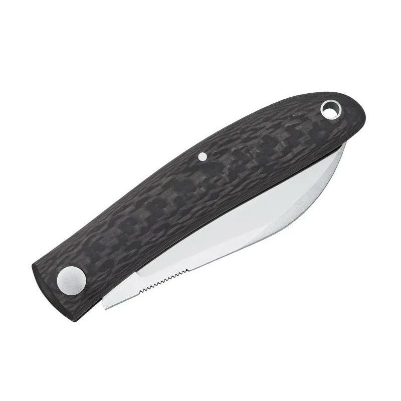 Le couteau Fox Knives Livri, modèle FX.273CF, est celui qui possède un joli manche en fibre de carbone. Un matĂ©riau des plus Ă©lĂ©gants, qui apporte style et lĂ©gèretĂ© au Livri qui est d’ailleurs ultra-lĂ©ger ! Confortable Ă manier, la poignĂ©e en fibre de carbone est munie d’un bouton dĂ©coratif, il y a aussi un passe-lacet permettant d’attacher aisĂ©ment le couteau, via un bout de ficelle ou de fine corde. Le manche mesure prĂ©cisĂ©ment 85mm de longueur ce qui aura pour incidence de rendre le transport toujours très aisĂ©, et cela en toutes circonstances.